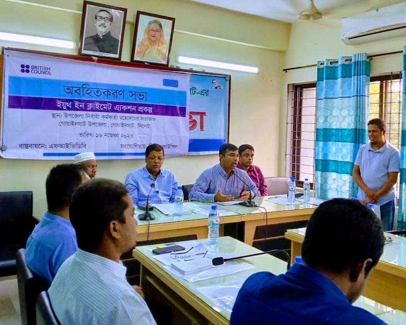 গোয়াইনঘাট প্রতিনিধি, মতিউর রহমান (দুলাল):সিলেটের গোয়াইনঘাট উপজেলায় এফআইভিডিবি ইয়ুথ ইন ক্লাইমেট এ্যাকশন প্রকল্পের অবহিত করন সভা অনুষ্ঠিত হয়েছে। এফআইভিডিবির বাস্তবায়নে